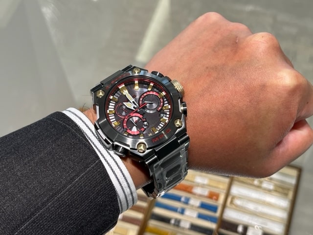 扇や屏風をイメージした文字板外周のヒラヒラや、日本刀の反りをイメージしたインデックスなど、和の美意識を表現したというMRG-B2000シリーズのデザインにまさにピッタリなカラーです。