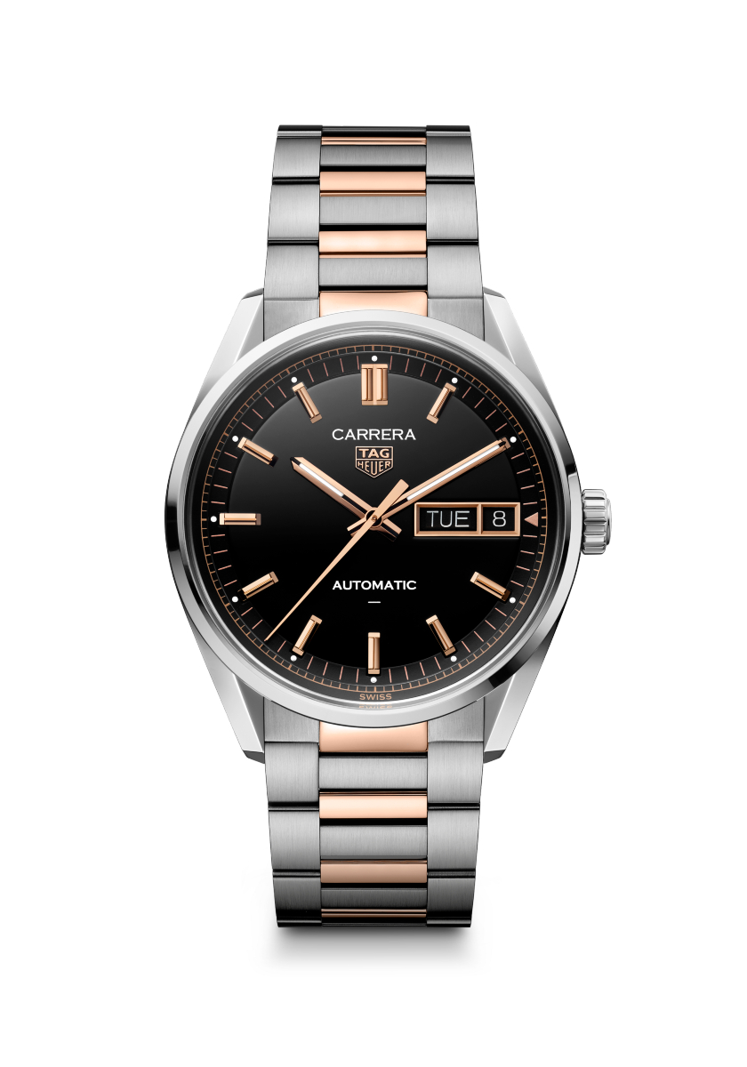 ブラック オパーリン ダイヤルには、18K 5N ローズゴールドプレートのインデックスと針が組み合わされ、ラグジュアリー感を演出。ポリッシュ仕上げのステンレススティール製ケースがコントラストを添え、このウォッチの個性を放っています。ケースバックには、成功のシンボルとしてのカレラのレガシーを永遠のものとする、“ビクトリーリース”が刻印されています。
