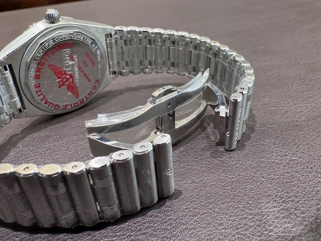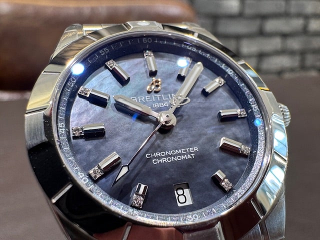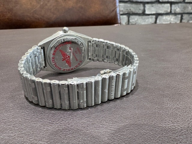 ルーローブレスレットは観音開きとなっており、ス着後スッキリと収まるようにデザインされています。ムーブメントは、、COSC認定SuperQuartz™クロノメーターのブライトリング「キャリバー77」を搭載しています。