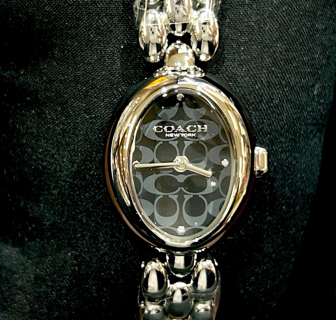 COACHのシグネチャーパターンの文字盤に、ポリッシュドマーカーがアクセントを添えます。