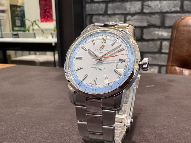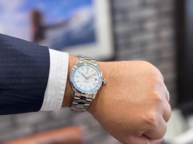 ホワイトとスカイブルーのツートーンカラー文字盤は、明るく軽やかな印象を与えてくれます。