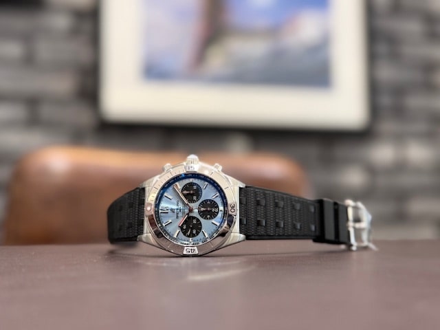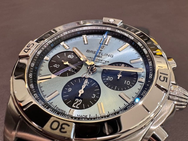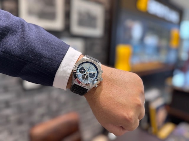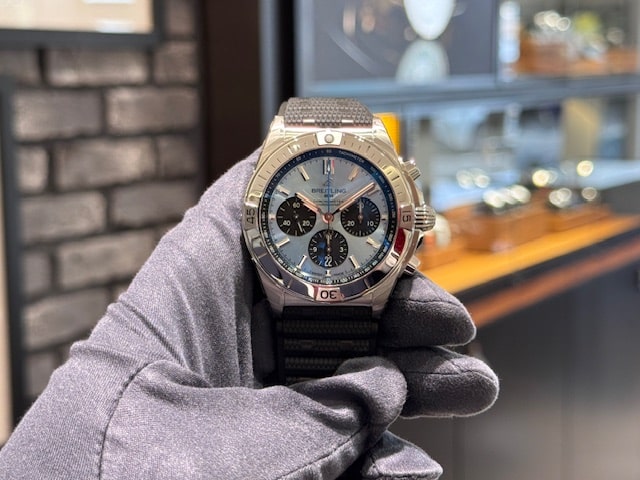 みなさま、こんにちは。いつもブログをご覧いただき、ありがとうございます。さて、本日ご紹介するモデルは、人気のアイスブルー文字盤と、プラチナを使用したベゼルを持つ特別仕様のクロノマットのご紹介です。