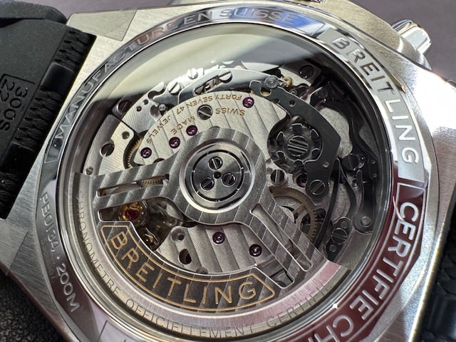 搭載ムーブメントは、COSC公認クロノメーターのブライトリング自社開発製造「自動巻き Cal.B01」。非常に優れたムーブメントで、70時間のパワーリザーブを持ち、日付けの早送りも24時間どこで行っても機械に影響が出ないように設計されています。現在ブライトリングの自動巻クロノグラフのほとんどが、このムーブメントがベースになっている機械を搭載しています。その優秀な機械の動きを、シースルーバックの裏蓋から楽しむことができます。