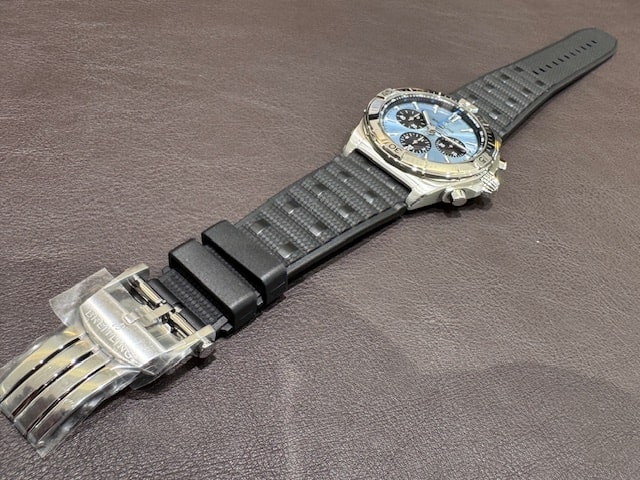 クロノグラフの秒針(センターセコンド)は、文字盤のアイスブルーより少し深みのあるブルーに仕上げ、文字盤に色が入りすぎないように工夫されています。ラバーベルトは、クロノマットのブレスのデザインに合わせた「ルーローラバー」が装着され、クロノマットのデザインにマッチしています。バックルはディプロインバックルなので、取り外しもしやすいです。