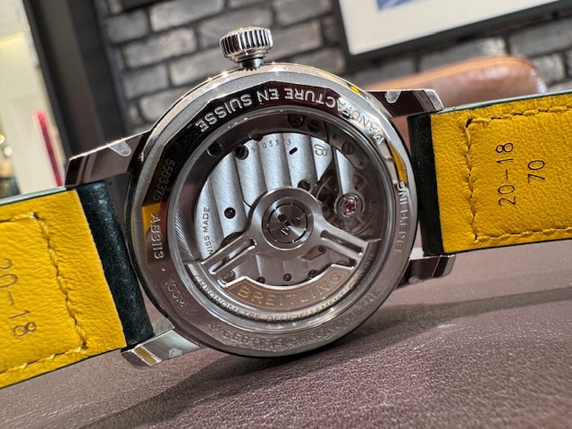 搭載されているのは、ブライトリング初の3針マニュファクチュールムーブメントであるCal.B31。4年の歳月をかけて開発され、COSC認定クロノメーターでありながら、約78時間のパワーリザーブとフリースプラングテンプによる高精度を実現しています。その美しい機構は、サファイアクリスタル製のシースルーバック越しに鑑賞することができます。