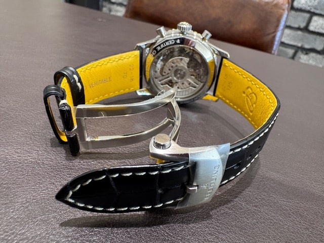 ケースサイズはナビタイマークロノグラフの中では一番小ぶりの41mmサイズ。近年、小ぶりのクロノグラフを求めてご来店される方も多いので、そういう方にオススメのモデルです。そして、なんといってもクラシック感漂うナビタイマーの顔に、革ベルトが良く似合います。当店でも、ブレスレットで購入し、革ベルトは別でオーダーし付け替えを楽しむお客さも多いモデルです。