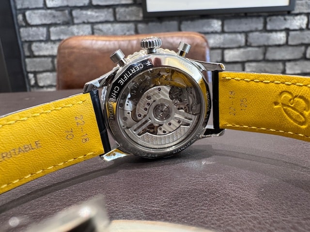 バックルは三折れ式のディプロインバックルなので、革の痛みを最小限に抑えることができます。また、脱着もしやすいので非常に便利です。裏蓋はシースルーバックになっていますので、自社キャリバーの動きを楽しむことができます。
