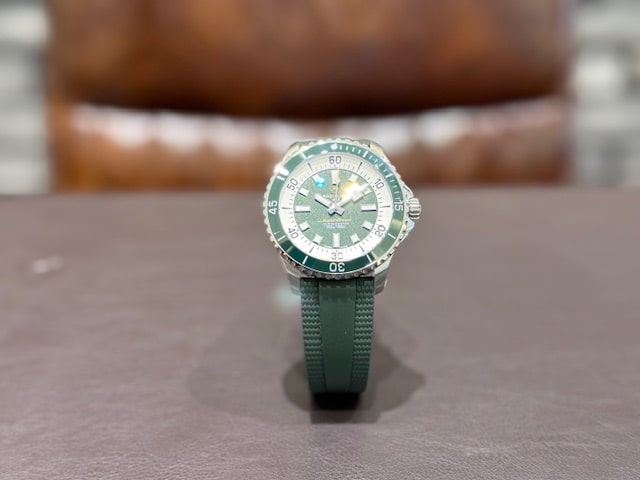 44mmの迫力あるケースサイズに、深みのあるグリーン文字盤と同色ラバーストラップを組み合わせた、スポーティさと大人の落ち着きを両立した一本です。