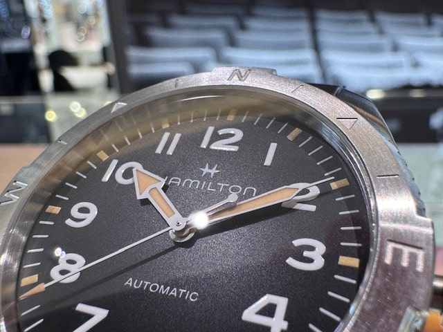 「カーキ フィールド エクスペディション」は、ミリタリーウォッチとしての強いDNAとスピリットを兼ね備えていますが、今回はトレンドであるアウトドアやアドベンチャーの空気を強く落とし込んだ形で誕生しています。ハミルトンとしては、昔からのカーキフィールドのエッセンスは残しながらもミリタリーの世界から離れた新しい時計を作りたかったようです。たしかに、ほかのカーキフィールドとは違うエッセンスが加えられたのがデザインを通して分かりますね。主張のあるコンパスデザインの両回転ベゼルの顔立ちは、一気にアウトドアテイストへと振れています。