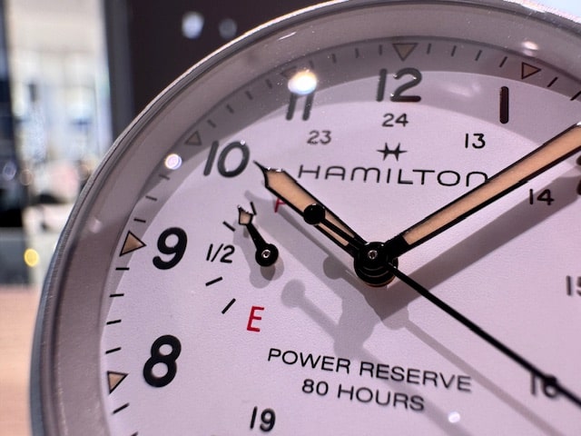 文字盤に「power reserve 80 hours」(標準持続時間80時間)と表示され、「F」で満タンを、「E」で空であることを示し、残りの稼働時間が分かる実用性を重視したモデルとなっています。この機能を支えるのが、ETA社がハミルトンのためだけに開発した、新しいH-23手巻きムーブメント。標準持続時間80時間のすぐれた手巻ムーブメントです。