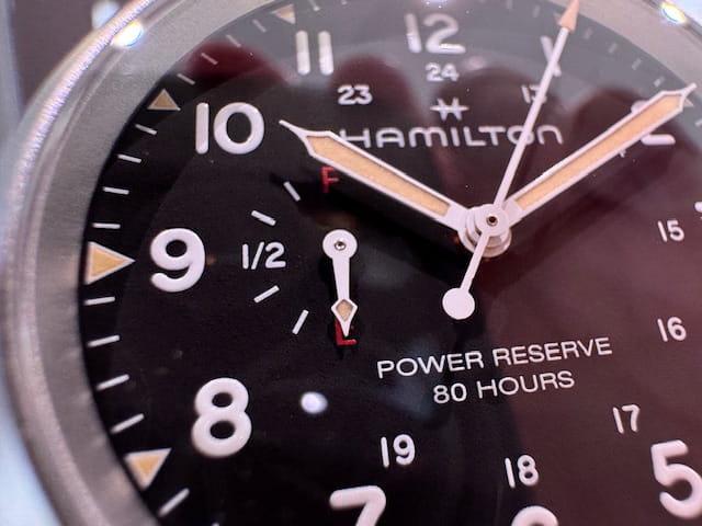 ブラックのダイヤルに大きなアラビア数字が並び、12時間・24時間表記で直感的に時刻が読み取れる設計。ハミルトン伝統のミリタリーテイストを継承したルックスで、実用性が徹底されています。