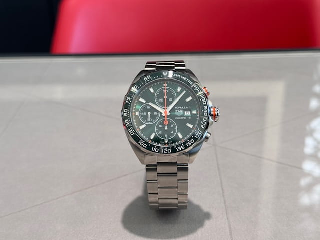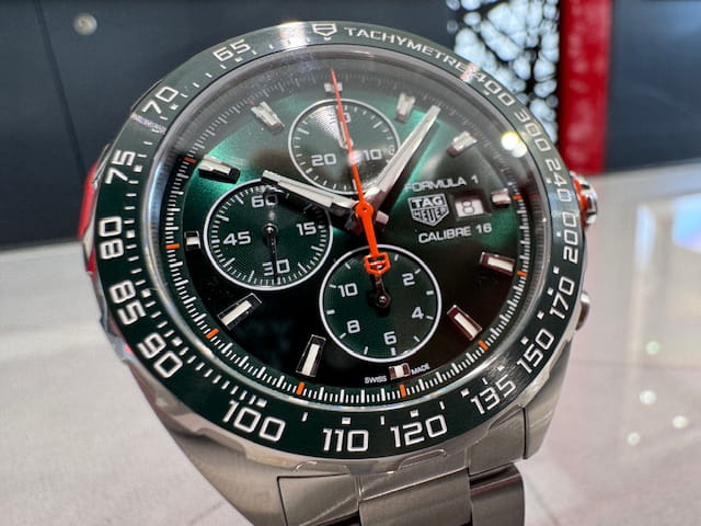 タグ・ホイヤー フォーミュラ1 クロノグラフは、鋭いセンスを持つドライバーに最適なウォッチです。生き生きとしたオレンジのアクセントが映える美しいグリーンのダイヤルを備えた、44mmサイズのこのタイムピースは、ダイナミックで洗練されたスタイルの象徴です。
