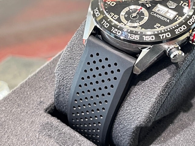 パンチング加工を施したラバーストラップは、この精密なクロノグラフに留まることのない性能と印象的なラグジュアリー感を加えています。