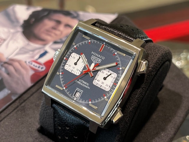 1969年に誕生した「モナコ」は、世界初の角形防水時計であり、世界初の自動巻きクロノグラフです。発売当時革新的だったこのタイムピースは、”キング・オブ・クール”の異名を持つ俳優、スティーブ・マックイーンに愛された伝説の逸品です。