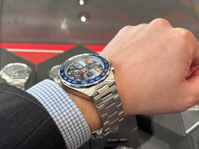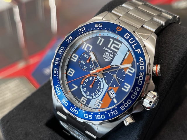 タグ・ホイヤーとガルフが紡ぎ続ける伝説的なパートナーシップを思わせる、大胆でエネルギッシュなクロノグラフです。