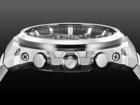 ベゼルは無駄をそぎ落としたデザインで、直線と円形のヘアライン、ミラー仕上げの3種類で磨き分けてメタルの質感を引き出した。八角形のケースやレンガパターンを施した文字板など、初号機「DW-5000C」の要素を継承したデザインも取り入れています。