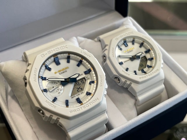 2025年のクリスマスシーズンを彩るスペシャルモデルです。 クリスマスツリーのオーナメントをイメージしたホワイト×ブルーの爽やかなカラーで、普段使いできるデザインです。 ダイアルに透明蒸着を施し質感を高め、インデックスにはブルー蒸着を施し、シルバー・ゴールドの差し色がクリスマスの華やかさを演出。マットホワイトのベゼルとバンドに、G-SHOCKロゴおよびアワーマーカーのゴールドが特別感を添えます。裏蓋にはラバーズコレクションのシンボル「天使&悪魔」を刻印。大切な人との絆を見守ります。