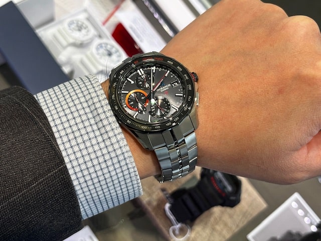 ベースモデルは“OCW-S7000”。デュアルカーブガラスに沿って美しい曲線を描くケースフォルムや9.5mmの薄型ケースなど、オシアナスマンタならではの優雅さを継承しつつ、サファイアガラスにタキメーターを採用。