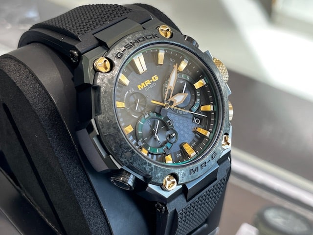 MRG-B2000RGはベゼルに再結晶チタンを採用し、独特の結晶模様で日本刀の刃文に見られる沸(にえ)を表現。チタン製のケースとともに、グリーンDLCコーティングを施しています。