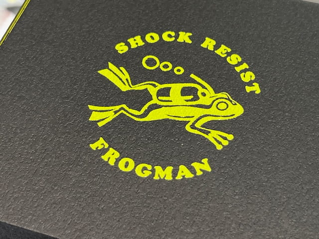 ケース裏のカエルのキャラクター刻印も「ミスジヤドクガエル」の縦縞模様を纏った特別仕様に仕上げています。