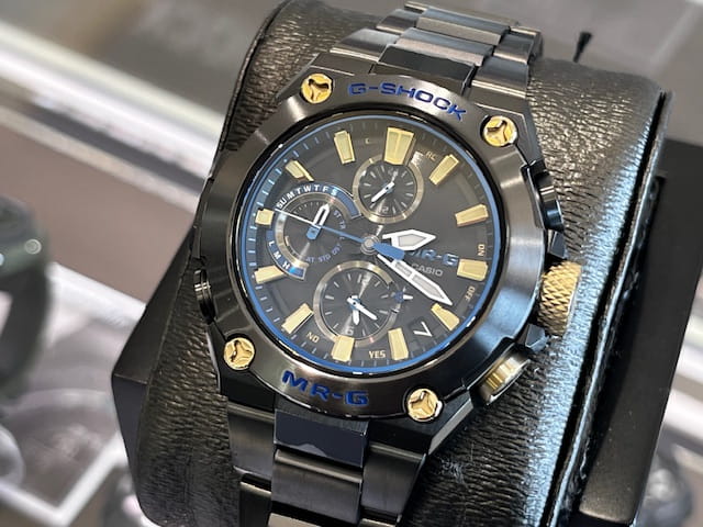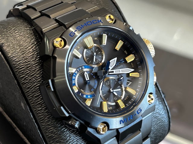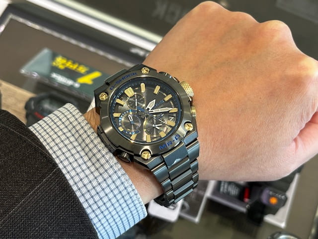 G-SHOCKの最上級ライン「MR-G」の、日本の伝統色「勝色(かちいろ)」をデザインに落とし込んだミッドサイズモデルです。