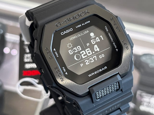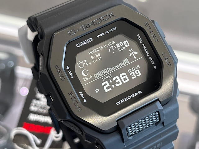 世界のトップサーファーから支持を受けるG-SHOCKのスポーツラインG-LIDE。スマートフォン連携機能を搭載したGBX-100のナイトサーフィンをイメージしたカラーです。