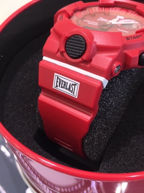 ベースモデルにはスマートフォンとのBluetooth®通信による機能連携により、スポーツをより身近に楽しむことができる機能を搭載したGBA-800「G-SQUAD」を採用。カラーリングはブランドの象徴となるボクシンググローブを連想させるマットな質感のレッドでクールに仕上げています。文字板、バンド、裏蓋に「EVERLAST」のロゴをプリント。また、ライト点灯時にはブランドのフィロソフィー「Choice of Champions」の文字が浮かび上がります。