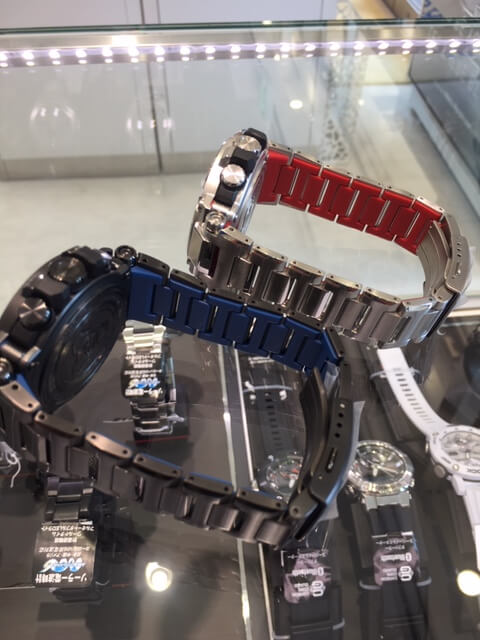 こちらのモデルは、文字板の各パーツとバンド裏面でアクセントカラーを表現。上質なケース・バンドにはメタリックカラーを配色し、手元を鮮やかに演出します。バンド裏面には軽量かつ高い耐久性を誇るファインレジンパーツを組み合わせ、色鮮やかなカラーリングと軽量化、そしてタフネスを追求。またファインレジンの素材はステンレスに比べ熱伝導率が低いため、寒い冬でも手元に冷たさが伝わりづらく快適に装着することができます。メタルと樹脂を融合したMT-Gならではの仕様です。