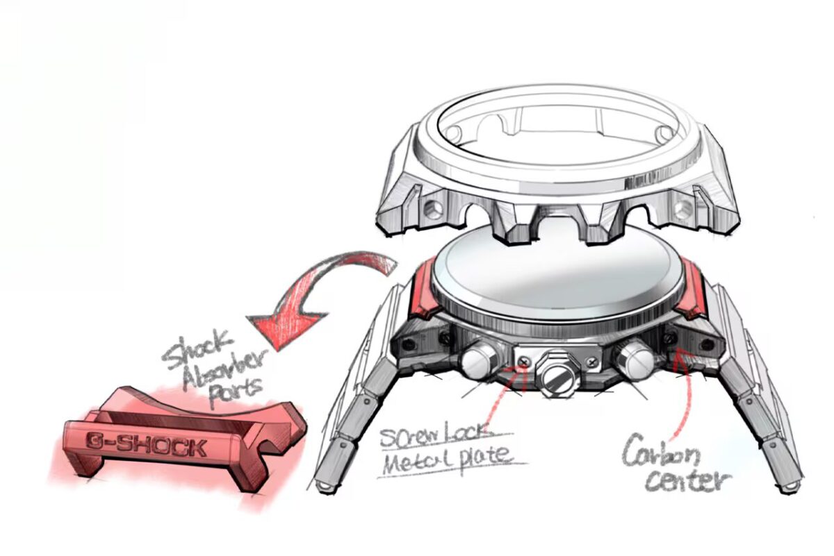 ベゼルとセンターケースを上下で連結した構造を開発。ケースサイドから見える造形が構造の美しさを強調。フルメタルながらG-SHOCKの耐衝撃基準をクリアし、気密性に優れたスクリューバックケースも採用しています。