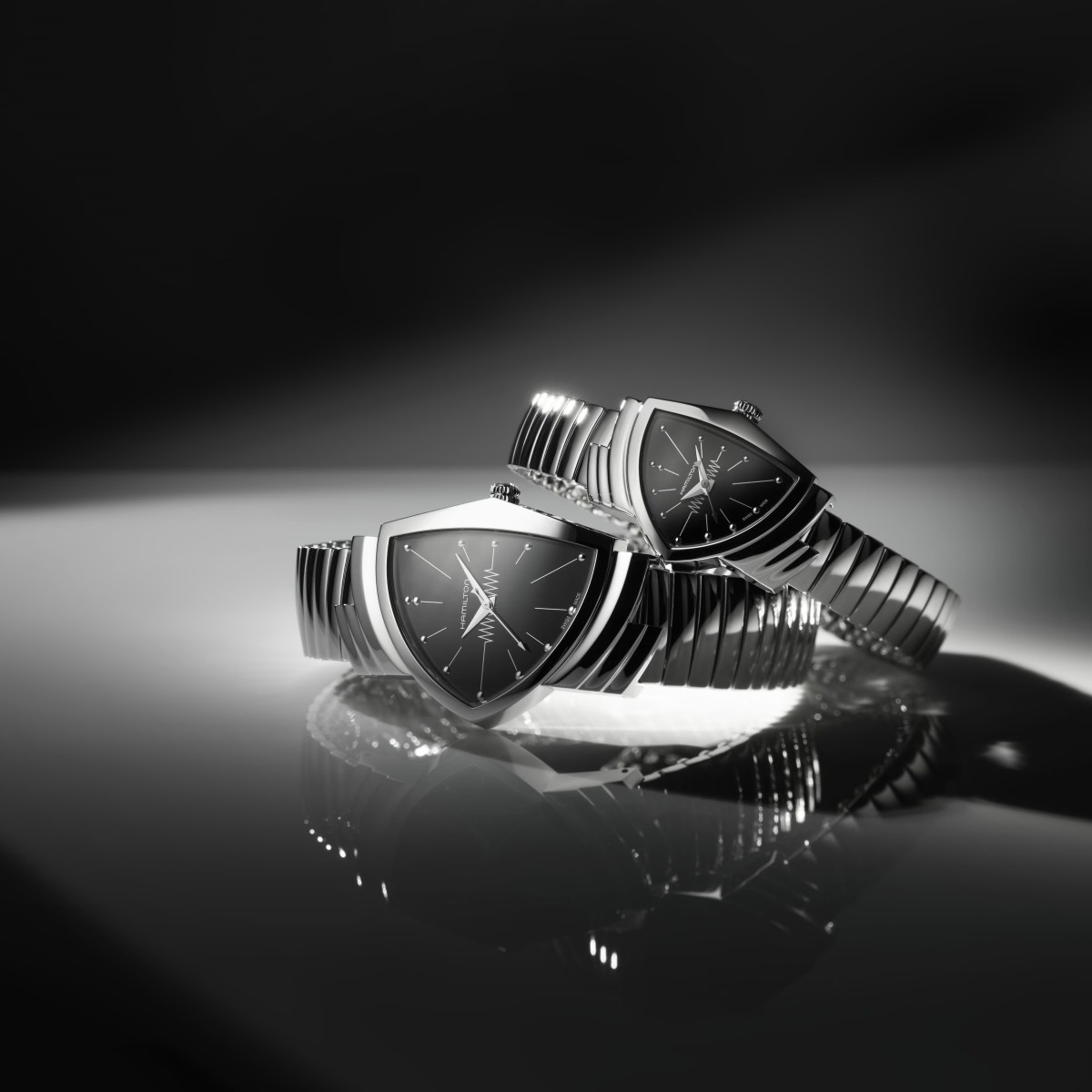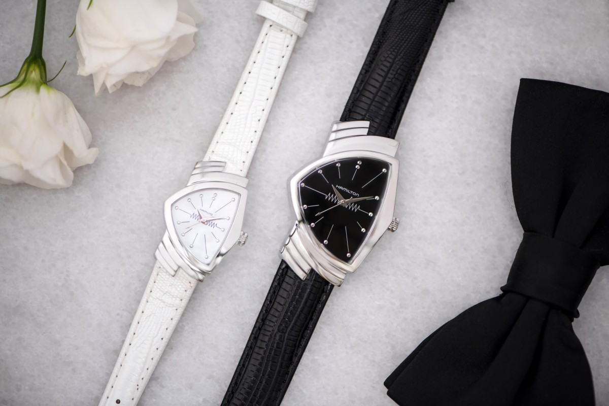1957年に発売された「ベンチュラ」は、世界初の電池式腕時計として時計史に革命を起こしました。革新的で大胆なデザインを備え、ハミルトンのアイコンウォッチとして不動の人気を誇ります。20世紀半ばのアメリカのモダンデザインを色濃く反映したスタイリッシュなフレックスベルトを採用した「ベンチュラ」は、おしゃれなふたりにぴったりです。