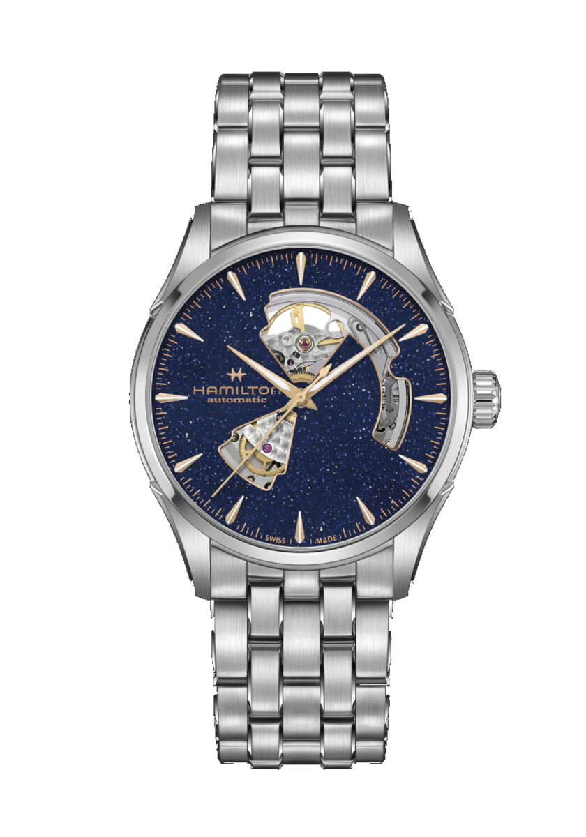 ニヴァクロン™製ヒゲゼンマイにより、標準持続時間80時間を誇る「ジャズマスター オープン ハート」には、エレガントなブルーレザーストラップが合わせられています。