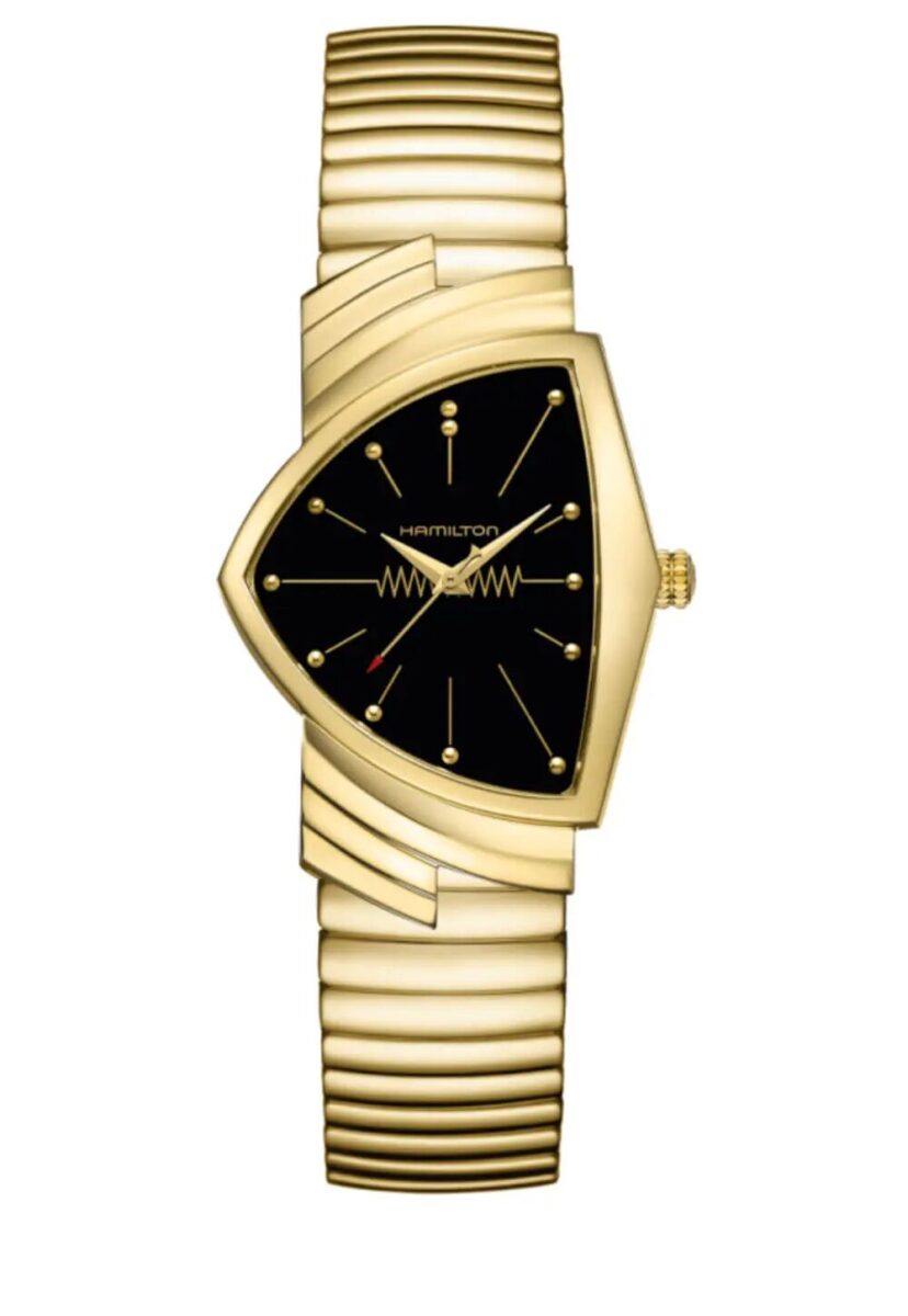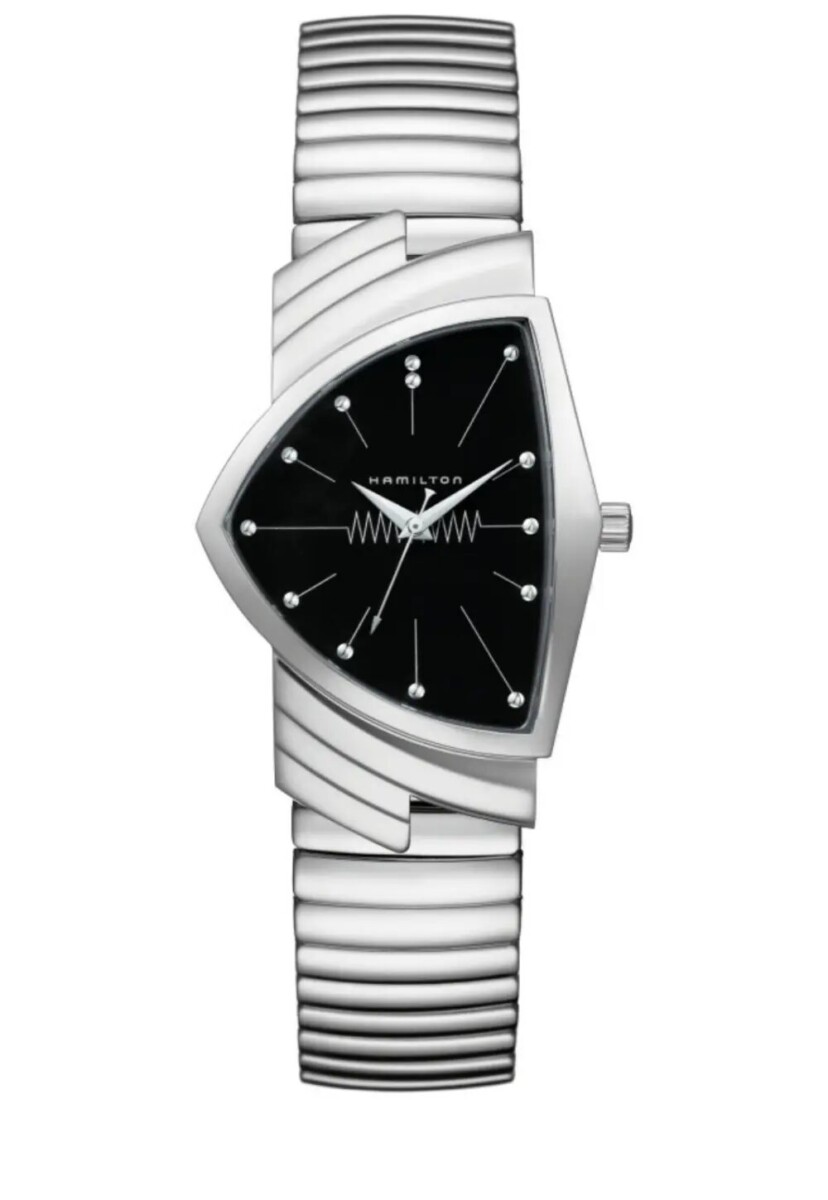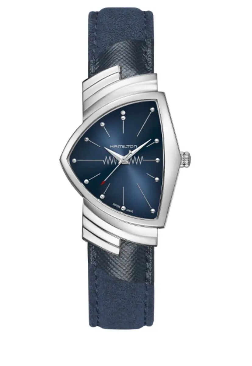 1957年、ハミルトンは世界初の電池式腕時計である「ベンチュラ」を発表しました。この革新的なタイムピースは、フューチャリスティックなデザインの象徴、そして革新のシンボルとしてその名を馳せ、ウォッチメイキングに新たな時代をもたらしました。エルヴィス・プレスリーの大ヒットシングル『ブルー・スエード・シューズ』にインスパイアされた「ベンチュラ」は、ニッケルの時針、分針、秒針を備え、高い信頼性を誇るクォーツムーブメントを搭載しています。アイコニックな三角形のステンレススチール製ケースにはフレックスブレスレットが組み合わされ、ディープブルーのダイヤルがエルヴィスの有名なシューズを思い起こさせます。