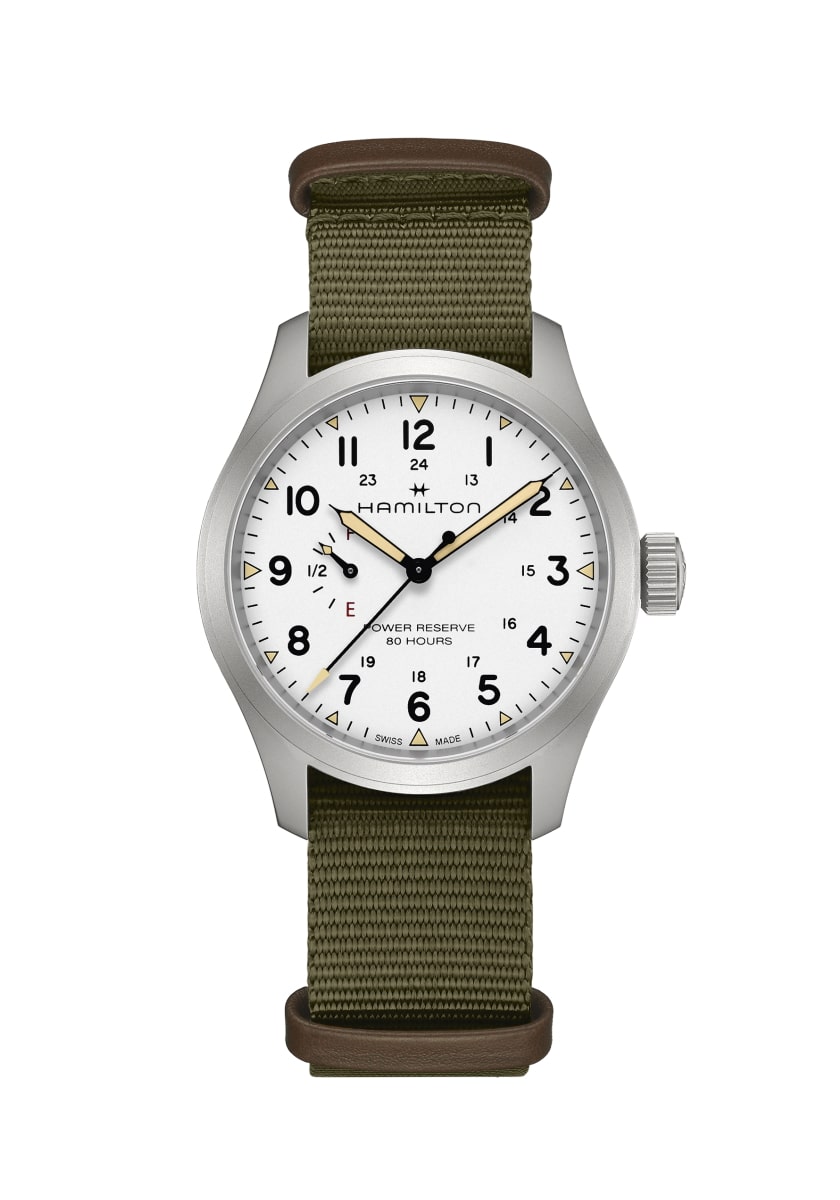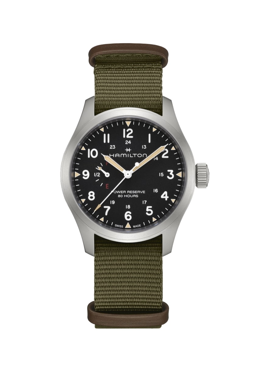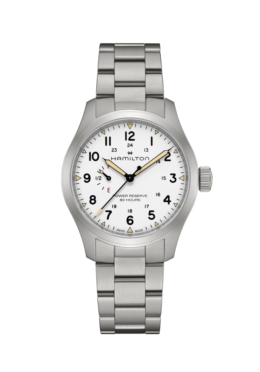 「カーキ フィールド メカ パワーリザーブ」は、「カーキ フィールド」コレクションの伝統的なデザインと欠かせない機能性を尊重しながら、現代的な機能や、最新のウォッチメイキング技術や革新性を取り入れています。ETA社がハミルトンのためだけに開発した、新しいH-23手巻きムーブメントを搭載し、初めて標準持続時間80時間をダイヤル上で直接確認することができるようになりました。ステンレススチール製メタルブレスレットを備えたブラックのダイヤルには、誇らしげに「power reserve 80 hours」(標準持続時間80時間)と表示され、「F」で満タンを、「E」で空であることを示し、実用性を重視したこの特別な機能を強調しています。